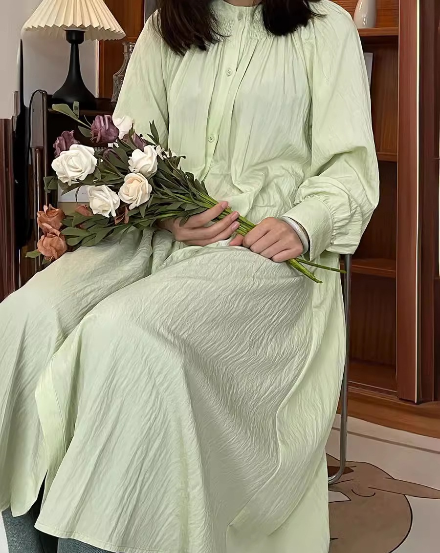 French Solid Color Tie Drawstring Long Sleeve Dress